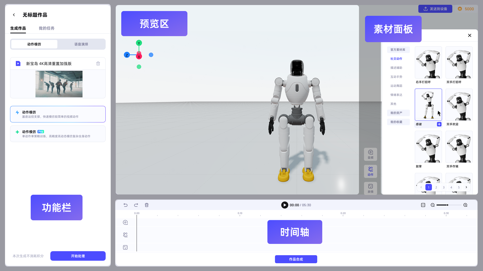 该功能支持用户利用多个动作,像剪辑视频一样编排机器人声音、动作与表情,精准控制每一帧动作节奏,为机器人设计丝滑过度的连续动作组合展示,堪称机器人动作设计领域的“剪映”。